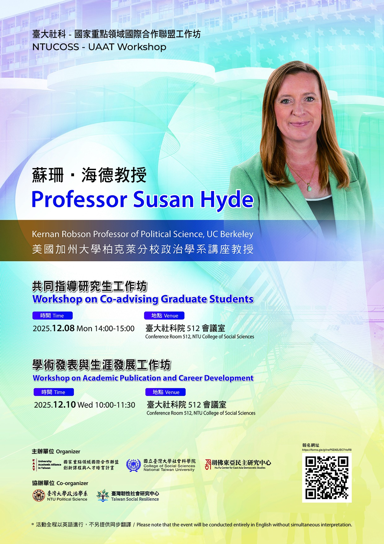 為深化臺灣本地全球民主研究之課程創新與人才培育,臺大社科院與國家重點領域國際合作聯盟共同主辦兩場工作坊,特邀美國加州大學柏克萊分校政治學系講座教授 Prof. Susan Hyde 於胡佛東亞民主研究中心舉辦兩場工作坊,與國家重點領域國際合作聯盟 12 校成員師生共同分享:(1)台大與柏克萊加大教師在社會科學領域共同指導研究生學位論文經驗與精進方案;(2)鼓勵台灣年輕教師與學子發表國際學術期刊論文與從事學術工作之生涯發展經驗。兩場工作坊註冊與報名資訊如下: