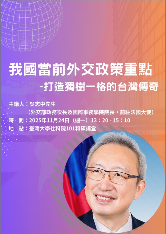 · 講者:吳志中先生(外交部政務次長及國際事務學院院長,前駐法國大使)