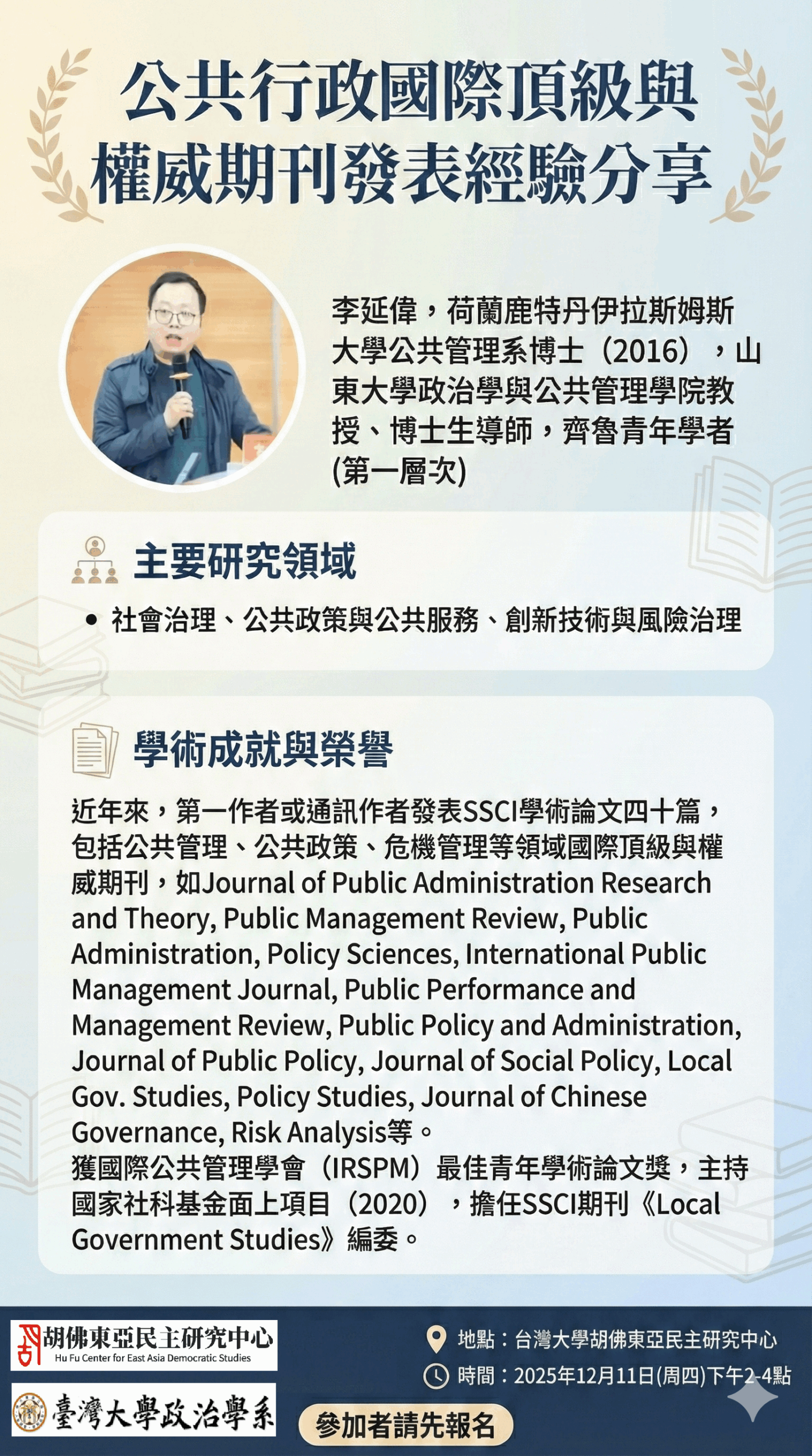 【演講】 [12月11日] 公共行政國際頂級與權威期刊發表經驗分享