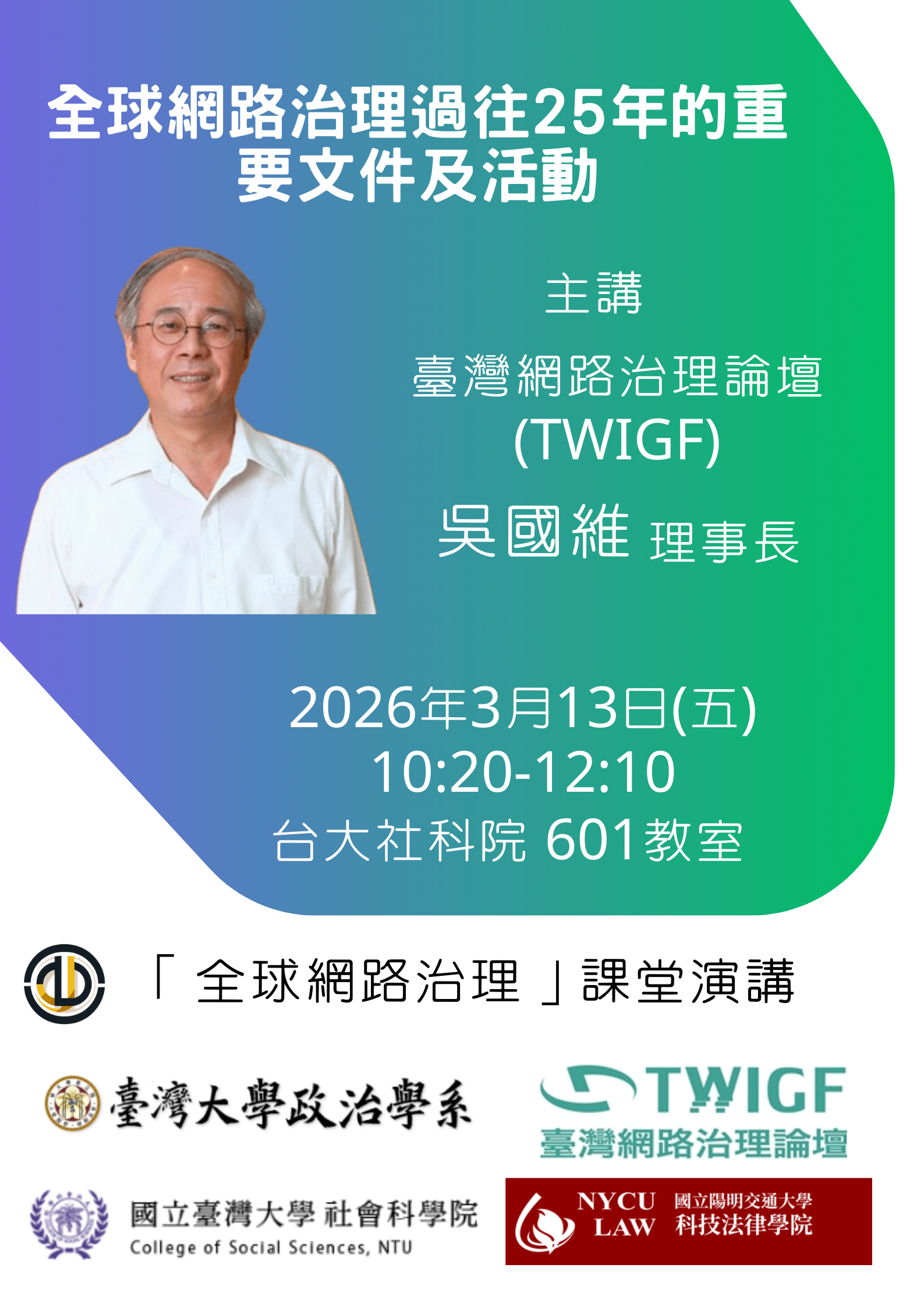 3/13 (五) 10:20-12:10 全球網路治理課堂演講