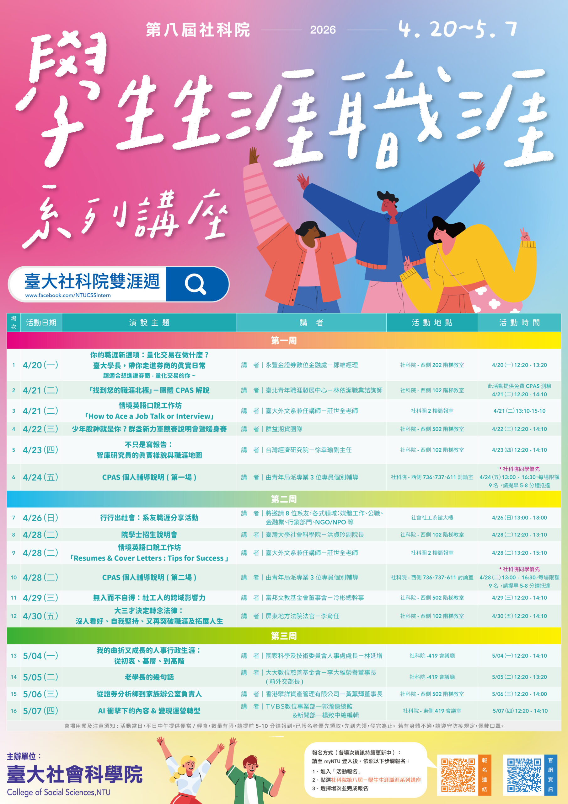社科院本年度的生涯職涯講座週即將於4月20日到5月7日舉辦,請按此進入各場次報名: 或登入myNTU >活動報名 > 【學生生涯職涯系列講座】即日起已經開放報名,今年依舊安排公私部門不同職涯、學涯的講者前來分享,搭配社科圖書館的主題書展「創造可能:擁抱未來的100種方式」,以及英語口說工作坊、職涯探索輔導,還有模擬競賽。各場次名額有限,歡迎同學把握機會喔!