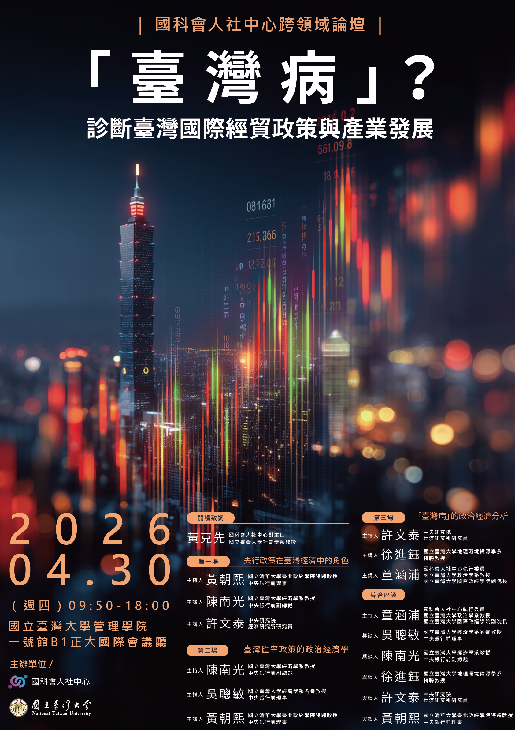 本活動將聚焦三大面向:首先,說明匯率如何型塑臺灣的經濟結構、資本流動與產業發展;其次,解析央行在穩定匯率與維持出口競爭力之間的權衡,以及不同政治與利益立場的政策偏好;最後,結合美中競爭、全球供應鏈重組,以及《經濟學人》所提出的「過度成功」及結構脆弱,探討匯率政策對通膨、薪資、資產價格與分配正義的政治影響。
