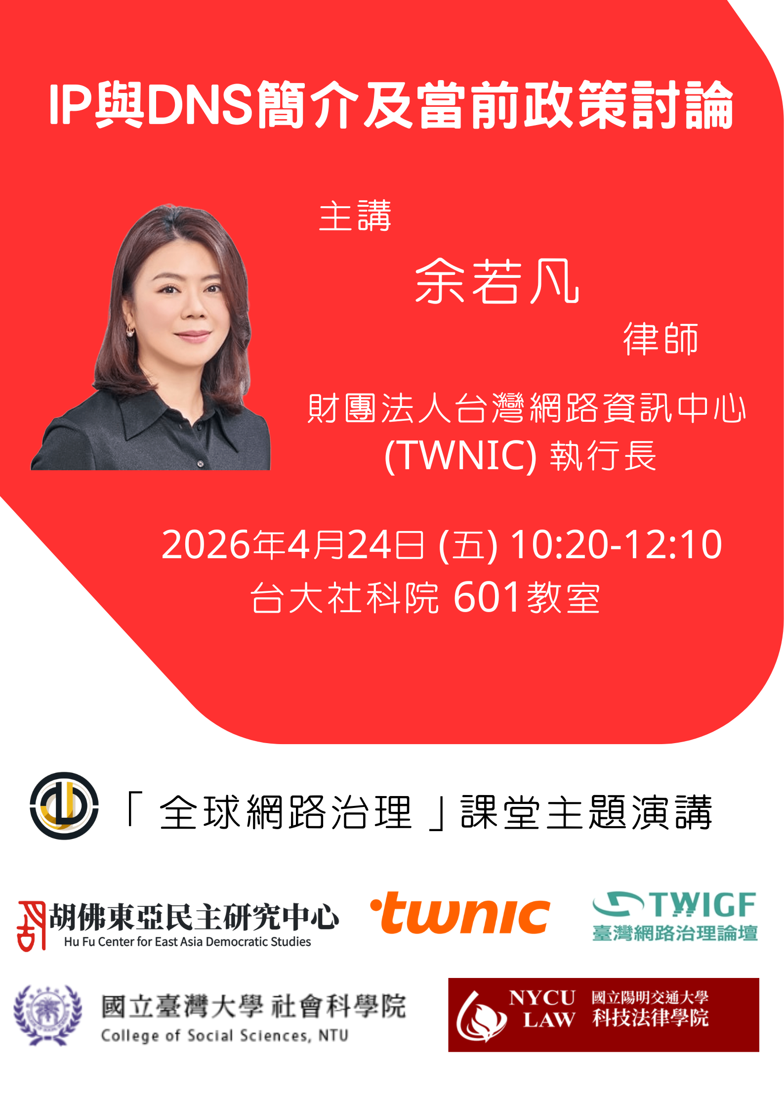 4/24 (五) 10:20-12:10 全球網路治理主題演講