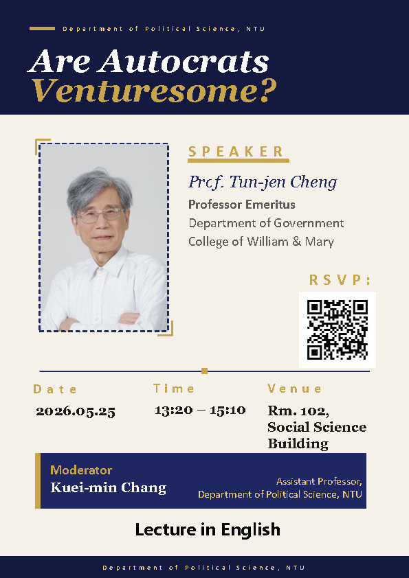 日期:2026/5/25 13:20-15:10 講者:鄭敦仁 講題:Are Autocrats Venturesome? 地點:社科102